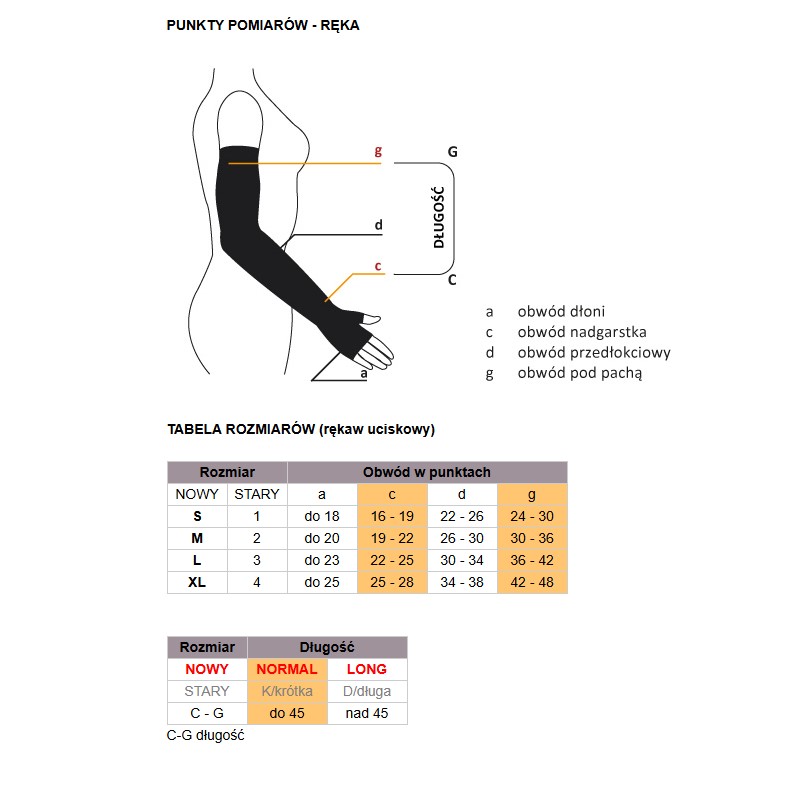 За предпочитане е измерването да се извърши сутрин, тъй като през деня крайниците се подуват и направените измервания няма да са правилни. Измерете обиколките във всички точки според таблицата с размери на продукта (разположението им върху крайника е показано на снимките). При определянето на размера ключовите стойности са в точките c (обиколка на китката) и g (обиколка на подмишницата). Също толкова важно е измерването на дължината на ръкава между точките c – g.