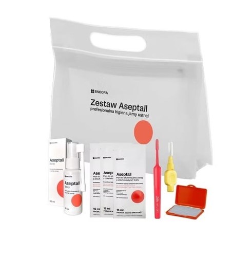 Комплектът за ортодонтски пациенти Aseptall осигурява цялостна защита и хигиена на устната кухина. Комплектът съдържа всичко, от което пациентът се нуждае за грижа, докато носи ортодонтски брекети.