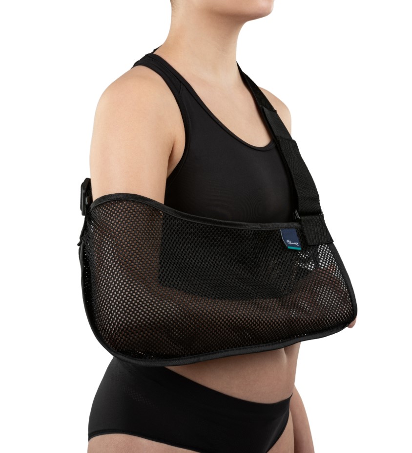 Ортезата за горния крайник е изработена от дишащ материал и е снабдена с гръдна лента, която се регулира с помощта на катарама и велкро. Коланът има мека възглавничка, която предпазва врата от протриване и прекомерен натиск.