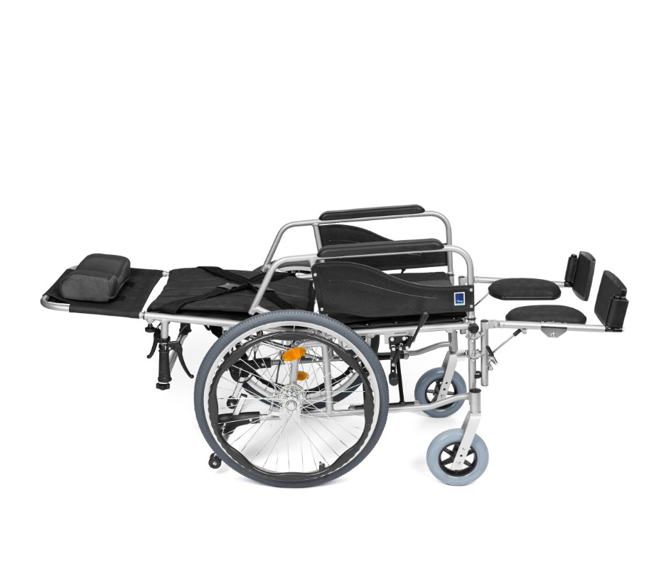РЕГУЛИРУЕМА – Инвалидната количка има удължена облегалка с регулируем ъгъл от 0° до 90°, която позволява на пациента да остане в легнало и полулегнало положение, което улеснява почивката, грижите и облекчава мускулното напрежение.